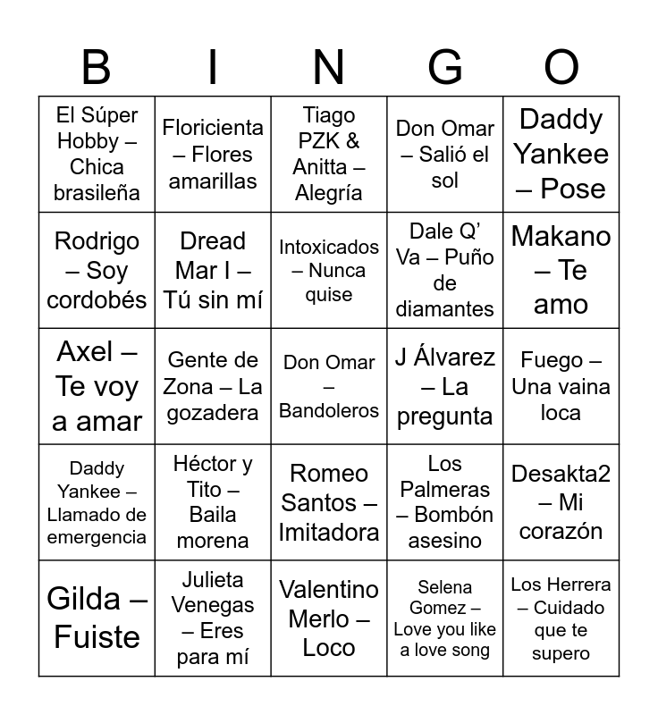 This bingo card has 1 images and 40 words: Axel – Te voy a amar, Airbag – Solo aquí, Dread Mar I – Tú sin mí, Julieta Venegas – Eres para mí, Romeo Santos – Imitadora, Intoxicados – Nunca quise, Daddy Yankee – Limbo, Daddy Yankee – Pose, Daddy Yankee – Llamado de emergencia, Gente de Zona – La gozadera, Don Omar – Salió el sol, Don Omar – Bandoleros, Fuego – Una vaina loca, J Álvarez – La pregunta, Héctor y Tito – Baila morena, Michel Teló – Ai se eu te pego, El Súper Hobby – Chica brasileña, Los del Fuego – Jurabas tú, Tiago PZK & Anitta – Alegría, Desakta2 – Mi corazón, Los Herrera – Cuidado que te supero, Valentino Merlo – Loco, Dale Q’ Va – Puño de diamantes, Dale Q’ Va – Mi marciana, Desakta2 – Según quién, Selena Gomez – Love you like a love song, Chino & Nacho – Niña bonita, Makano – Te amo, Calle 13 – Muerte en Hawaii, Franco de Vita & Alejandra Guzmán – Tan sólo tú, Floricienta – Flores amarillas, Gilda – Fuiste, Damas Gratis – Me vas a extrañar, Los Palmeras – Bombón asesino, Rodrigo – Soy cordobés, Luis Fonsi – Despacito, Bad Bunny – Tití me preguntó, Queen – We will rock you, Lady Gaga – Bad romance and David Guetta – Memories.