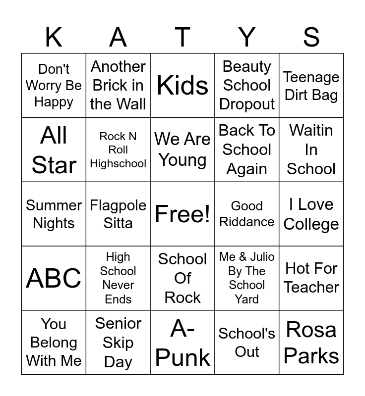 This bingo card has a free space and 32 words: School's Out, School Day, Flagpole Sitta, We're Going To Be Friends, ABC, Rock N Roll Highschool, Teenage Dirt Bag, Hot For Teacher, Another Brick in the Wall, Lip Gloss, We Are Young, Kids, School Days, Summer of 69, Good Riddance, Smells Like Teen Spirit, You Belong With Me, Summer Nights, School Of Rock, High School Never Ends, Me & Julio By The School Yard, Smokin in The Boys Room, I Love College, Senior Skip Day, Rosa Parks, Beauty School Dropout, Back To School Again, All Star, Don't Worry Be Happy, A-Punk, Don't Stand To Close To Me and Waitin In School.