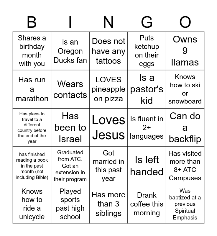 This bingo card has a free space and 24 words: Graduated from ATC. Got an extension in their program, Played sports past high school, LOVES pineapple on pizza, Knows how to ride a unicycle, Owns 9 llamas, Shares a birthday month with you, Has run a marathon, is an Oregon Ducks fan, Is fluent in 2+ languages, Got married in this past year, Is a pastor's kid, Has plans to travel to a different country before the end of the year, Is left handed, Has visited more than 8+ ATC Campuses, Wears contacts, Drank coffee this morning, Can do a backflip, Does not have any tattoos, Knows how to ski or snowboard, Has been to Israel, Was baptized at a previous Spiritual Emphasis, has finished reading a book in the past month (not including Bible), Puts ketchup on their eggs and Has more than 3 siblings.