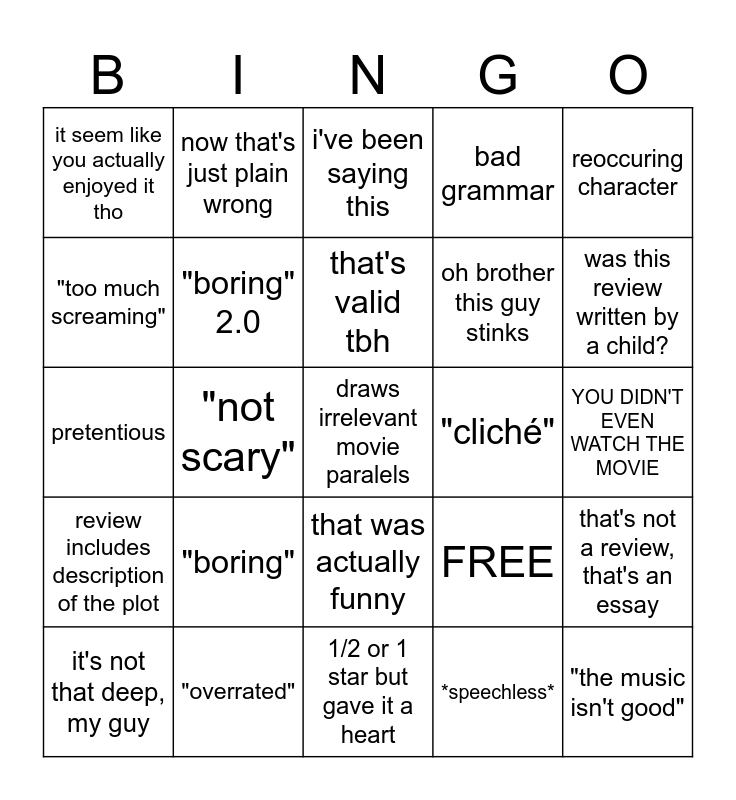This bingo card has 25 words: "boring", 1/2 or 1 star but gave it a heart, that's valid tbh, it's not that deep, my guy, reoccuring character, it seem like you actually enjoyed it tho, "too much screaming", now that's just plain wrong, "cliché", that was actually funny, oh brother this guy stinks, pretentious, FREE, that's not a review, that's an essay, "boring" 2.0, "the music isn't good", YOU DIDN'T EVEN WATCH THE MOVIE, i've been saying this, was this review written by a child?, "not scary", draws irrelevant movie paralels, "overrated", review includes description of the plot, bad grammar and *speechless*.