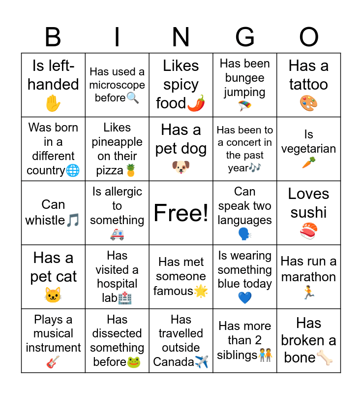 This bingo card has a free space and 24 words: Has visited a hospital lab🏥, Has dissected something before🐸, Has a pet dog🐶, Plays a musical instrument🎸, Has a tattoo🎨, Is left-handed✋, Was born in a different country🌐, Has used a microscope before🔍, Can speak two languages🗣️, Has met someone famous🌟, Has been to a concert in the past year🎶, Can whistle🎵, Is wearing something blue today💙, Has run a marathon🏃, Likes pineapple on their pizza🍍, Has more than 2 siblings🧑🤝🧑, Loves sushi🍣, Likes spicy food🌶️, Is vegetarian🥕, Is allergic to something🚑, Has broken a bone🦴, Has a pet cat🐱, Has been bungee jumping🪂 and Has travelled outside Canada✈️.