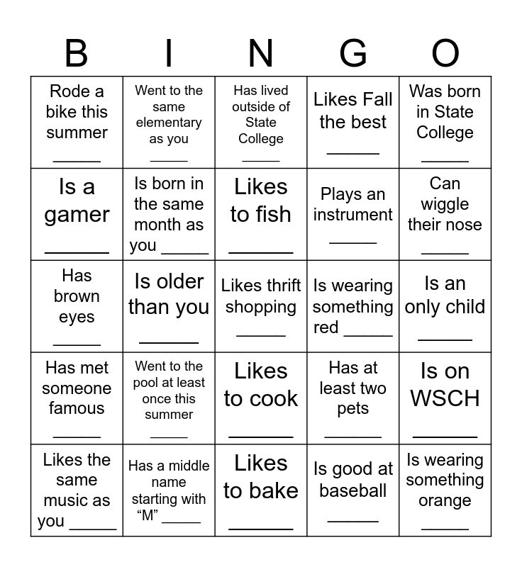 This bingo card has 33 words: Is wearing something orange _____, Is younger than you _____, Is older than you _____, Is left handed _____, Has met someone famous _____, Is born in the same month as you _____, Was born in State College _____, Likes the same music as you _____, Went to the same elementary as you _____, Likes the same pizza toppings as you _____, Likes to fish _____, Has lived outside of State College _____, Likes spicy food _____, Has ridden a motorcycle _____, Is wearing something red _____, Can wiggle their nose _____, Has a middle name starting with “M” _____, Has brown eyes _____, Went to the pool at least once this summer _____, Has at least two pets ______, Likes to cook _____, Ate breakfast today _____, Rode a bike this summer _____, Is an only child _____, Likes to bake _____, Likes thrift shopping _____, Likes Fall the best _____, Plays an instrument _____, Is a gamer _____, Is on WSCH _____, Is good at knots _____, Is good at baseball _____ and Is good at art _____.