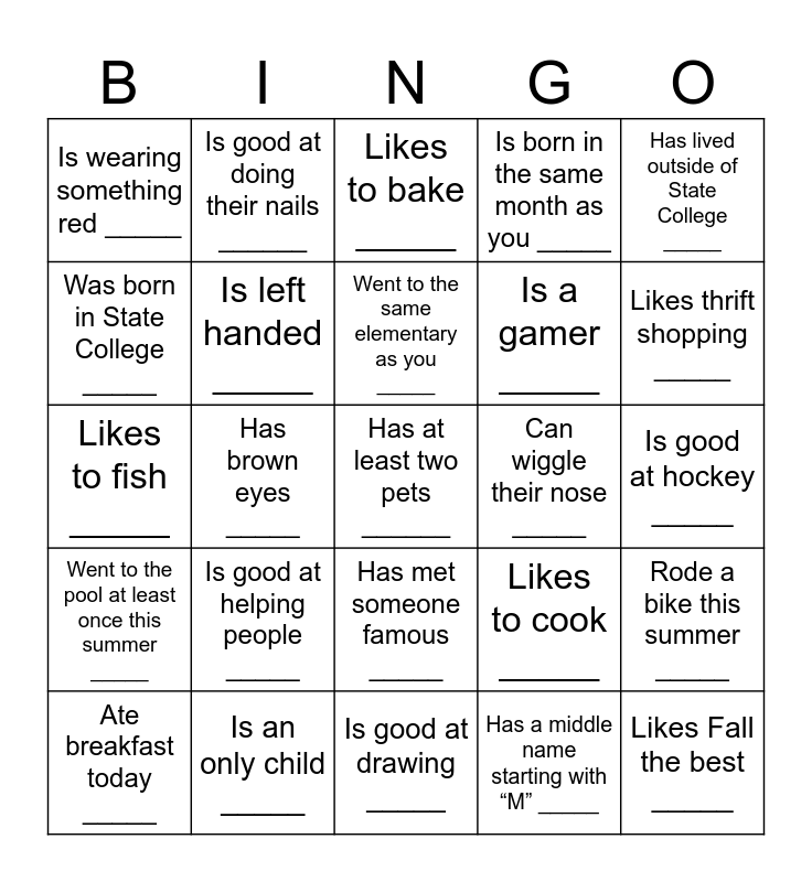 This bingo card has 35 words: Is wearing something orange _____, Is younger than you _____, Is older than you _____, Is left handed _____, Has met someone famous _____, Is born in the same month as you _____, Was born in State College _____, Likes the same music as you _____, Went to the same elementary as you _____, Likes the same pizza toppings as you _____, Likes to fish _____, Has lived outside of State College _____, Likes spicy food _____, Has ridden a motorcycle _____, Is wearing something red _____, Can wiggle their nose _____, Has a middle name starting with “M” _____, Has brown eyes _____, Went to the pool at least once this summer _____, Has at least two pets ______, Likes to cook _____, Ate breakfast today _____, Rode a bike this summer _____, Is an only child _____, Likes to bake _____, Likes thrift shopping _____, Likes Fall the best _____, Plays an instrument _____, Is a gamer _____, Is good at hockey _____, Is good at building _____, Is good at drawing _____, Is good at helping people _____, Is good at doing their nails ______ and Is good at acting _____.