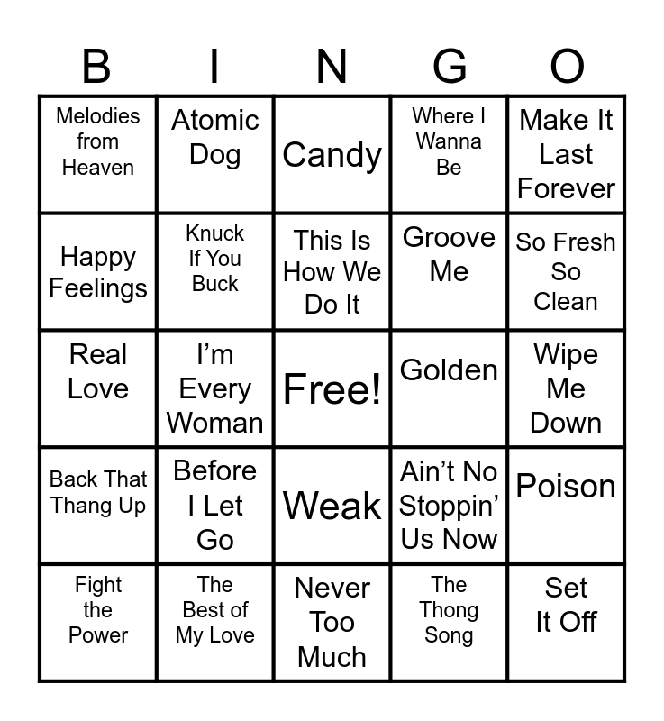 This bingo card has a free space and 24 words: Before I Let Go, The Best of My Love, This Is How We Do It, Fight the Power, Make It Last Forever, Melodies from Heaven, Happy Feelings, Atomic Dog, Golden, Weak, Groove Me, Real Love, Ain’t No Stoppin’ Us Now, Poison, Knuck If You Buck, The Thong Song, Wipe Me Down, Candy, So Fresh So Clean, I’m Every Woman, Set It Off, Back That Thang Up, Where I Wanna Be and Never Too Much.