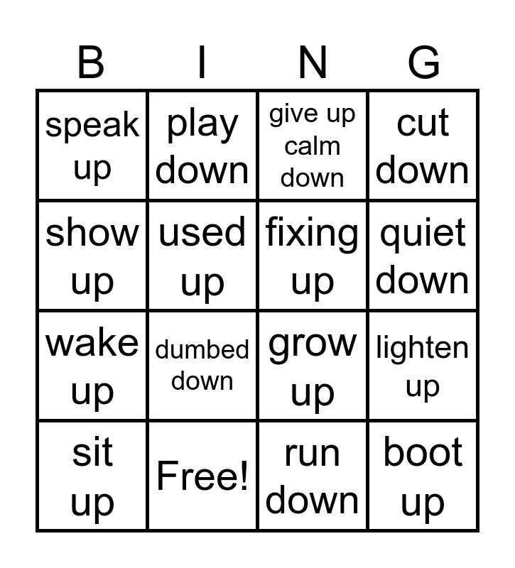 This bingo card has 16 words: Free!, lighten up, give up calm down, speak up, wake up, play down, grow up, run down, show up, used up, sit up, cut down, dumbed down, quiet down, fixing up and boot up.