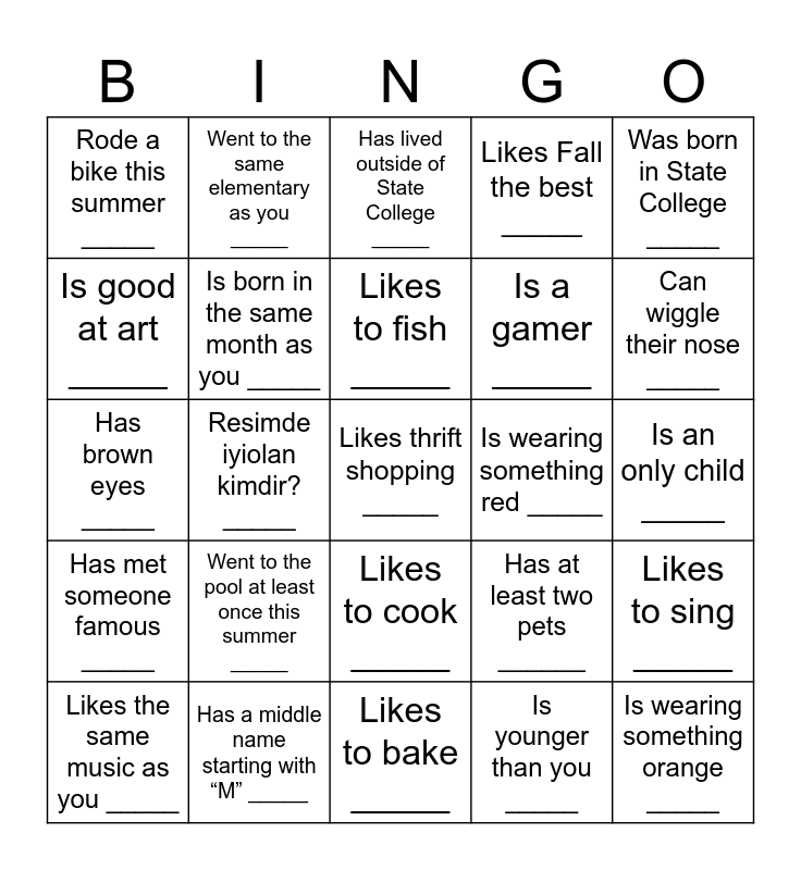 This bingo card has 34 words: Is wearing something orange _____, Is younger than you _____, Is older than you _____, Is left handed _____, Has met someone famous _____, Is born in the same month as you _____, Was born in State College _____, Likes the same music as you _____, Went to the same elementary as you _____, Likes the same pizza toppings as you _____, Likes to fish _____, Has lived outside of State College _____, Likes spicy food _____, Has ridden a motorcycle _____, Is wearing something red _____, Can wiggle their nose _____, Has a middle name starting with “M” _____, Has brown eyes _____, Went to the pool at least once this summer _____, Has at least two pets ______, Likes to cook _____, Ate breakfast today _____, Rode a bike this summer _____, Is an only child _____, Likes to bake _____, Likes thrift shopping _____, Likes Fall the best _____, Plays an instrument _____, Is a gamer _____, Is good at art _____, Speaks Turkish _____, Resimde iyiolan kimdir? _____, Likes to sing _____ and Likes to make music _____.