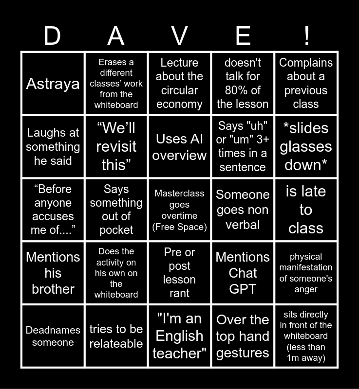 This bingo card has a free space and 32 words: Over the top hand gestures, Goes on a rant about responsibility, Says something out of pocket, Unrelated tangent, Mentions his brother, “We’ll revisit this”, Complains about a previous class, physical manifestation of someone's anger, Erases a different classes’ work from the whiteboard, Turns up his volume because nobody is listening to him, Uses AI overview, Lecture about the circular economy, Says something about people not caring about their work, Draws a bad diagram, Someone goes non verbal, Literally nobody is paying attention, Deadnames someone, “Before anyone accuses me of....”, Pre or post lesson rant, Does the activity on his own on the whiteboard, Mentions Chat GPT, Overshares, is late to class, tries to be relateable, sits directly in front of the whiteboard (less than 1m away), doesn't talk for 80% of the lesson, Says "uh" or "um" 3+ times in a sentence, Laughs at something he said, Astraya, "I'm an English teacher", Talks to the class without facing them and *slides glasses down*.