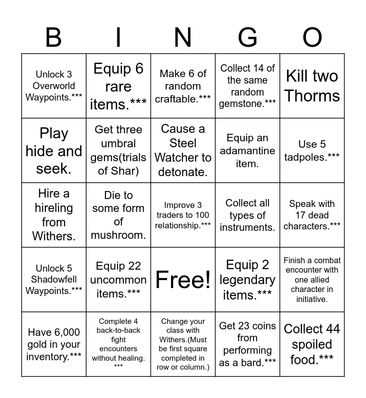 This bingo card has 26 words: Free!, Get 23 coins from performing as a bard.***, Cause a Steel Watcher to detonate., Complete 4 back-to-back fight encounters without healing. ***, Kill two Thorms, Unlock 3 Overworld Waypoints.***, Play hide and seek., Equip 6 rare items.***, Speak with 17 dead characters.***, Equip 2 legendary items.***, Equip an adamantine item., Hire a hireling from Withers., Finish a combat encounter with one allied character in initiative., Have 6,000 gold in your inventory.***, Die to some form of mushroom., Find 5 copies of the same book., Collect 14 of the same random gemstone.***, Unlock 5 Shadowfell Waypoints.***, Make 6 of random craftable.***, Improve 3 traders to 100 relationship.***, Use 5 tadpoles.***, Change your class with Withers.(Must be first square completed in row or column.), Collect all types of instruments., Equip 22 uncommon items.***, Get three umbral gems(trials of Shar) and Collect 44 spoiled food.***.