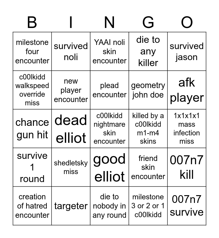 This bingo card has a free space and 24 words: shedletsky miss, targeter, plead encounter, creation of hatred encounter, survived jason, milestone four encounter, c00lkidd walkspeed override miss, survived noli, killed by a c00lkidd m1-m4 skins, good elliot, geometry john doe, chance gun hit, friend skin encounter, 007n7 kill, new player encounter, milestone 3 or 2 or 1 c00lkidd, 1x1x1x1 mass infection miss, YAAI noli skin encounter, afk player, dead elliot, 007n7 survive, survive 1 round, die to any killer and die to nobody in any round.