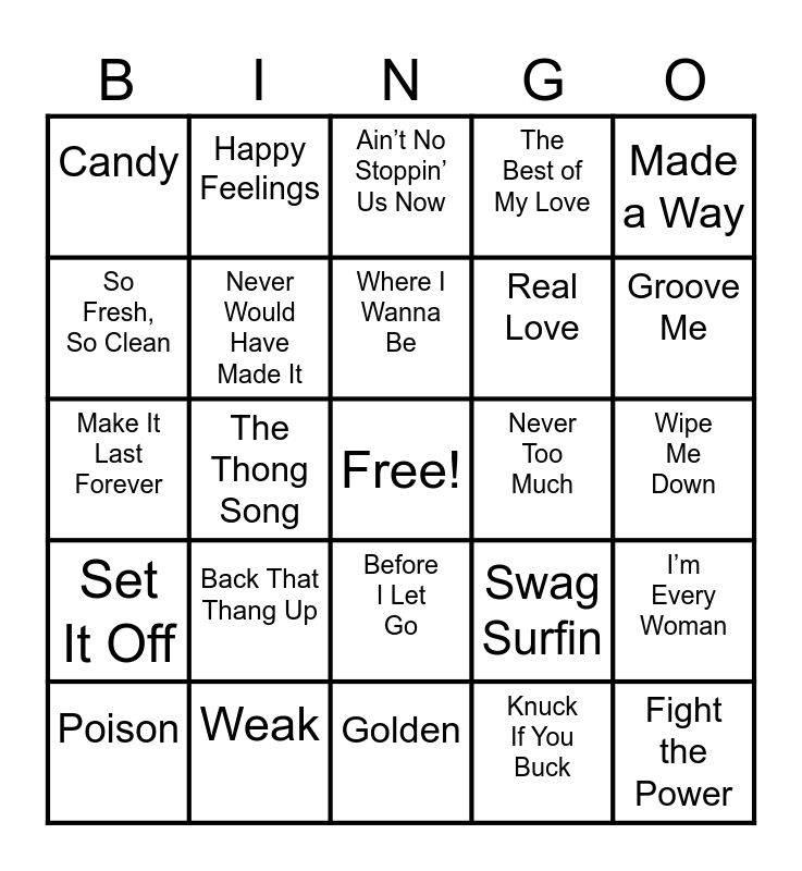 This bingo card has a free space and 24 words: Back That Thang Up, Weak, Where I Wanna Be, Poison, Made a Way, Candy, So Fresh, So Clean, Happy Feelings, Never Too Much, Before I Let Go, Real Love, Make It Last Forever, Swag Surfin, I’m Every Woman, Never Would Have Made It, Knuck If You Buck, Wipe Me Down, Ain’t No Stoppin’ Us Now, Groove Me, The Thong Song, Fight the Power, Set It Off, The Best of My Love and Golden.