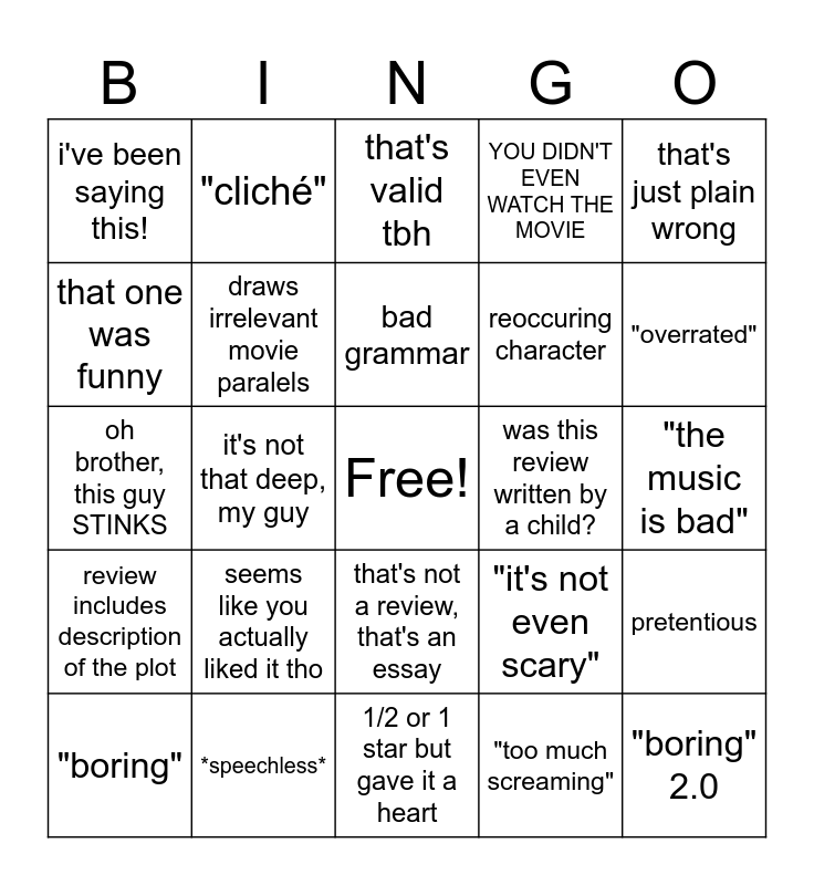 This bingo card has a free space and 24 words: "boring", seems like you actually liked it tho, bad grammar, "too much screaming", that's just plain wrong, i've been saying this!, "cliché", that's valid tbh, was this review written by a child?, "the music is bad", oh brother, this guy STINKS, draws irrelevant movie paralels, "it's not even scary", pretentious, that one was funny, *speechless*, 1/2 or 1 star but gave it a heart, YOU DIDN'T EVEN WATCH THE MOVIE, "overrated", review includes description of the plot, it's not that deep, my guy, that's not a review, that's an essay, reoccuring character and "boring" 2.0.