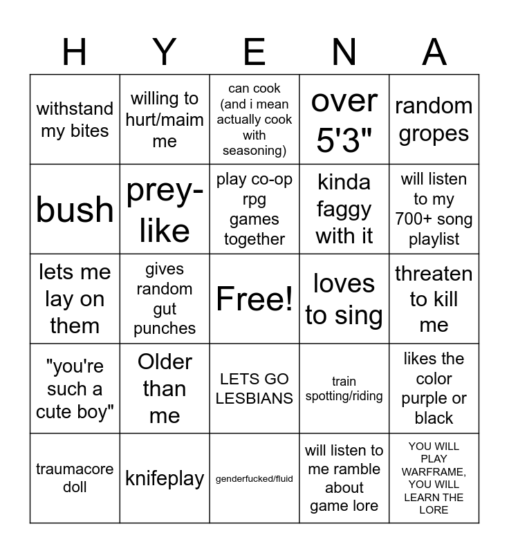 This bingo card has a free space and 24 words: Older than me, knifeplay, play co-op rpg games together, traumacore doll, random gropes, withstand my bites, bush, willing to hurt/maim me, loves to sing, LETS GO LESBIANS, kinda faggy with it, lets me lay on them, train spotting/riding, likes the color purple or black, prey-like, will listen to me ramble about game lore, threaten to kill me, can cook (and i mean actually cook with seasoning), will listen to my 700+ song playlist, gives random gut punches, YOU WILL PLAY WARFRAME, YOU WILL LEARN THE LORE, "you're such a cute boy", over 5'3" and genderfucked/fluid.