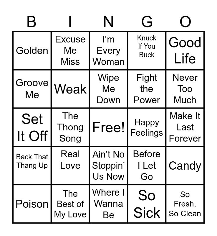 This bingo card has a free space and 24 words: Real Love, The Best of My Love, Wipe Me Down, Poison, Good Life, Golden, Groove Me, Excuse Me Miss, Happy Feelings, Ain’t No Stoppin’ Us Now, Fight the Power, Set It Off, Before I Let Go, Candy, Weak, So Sick, Make It Last Forever, I’m Every Woman, Never Too Much, The Thong Song, So Fresh, So Clean, Back That Thang Up, Knuck If You Buck and Where I Wanna Be.