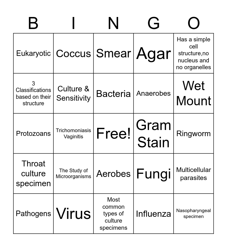 This bingo card has a free space and 24 words: The Study of Microorganisms, Virus, Bacteria, Pathogens, Has a simple cell structure,no nucleus and no organelles, Eukaryotic, 3 Classifications based on their structure, Coccus, Gram Stain, Aerobes, Anaerobes, Protozoans, Fungi, Multicellular parasites, Culture & Sensitivity, Influenza, Ringworm, Smear, Wet Mount, Trichomoniasis Vaginitis, Nasopharyngeal specimen, Throat culture specimen, Agar and Most common types of culture specimens.