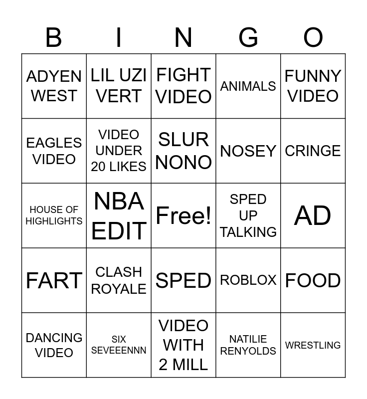 This bingo card has a free space and 24 words: CLASH ROYALE, SIX SEVEEENNN, SLUR NONO, DANCING VIDEO, FUNNY VIDEO, ADYEN WEST, EAGLES VIDEO, LIL UZI VERT, SPED UP TALKING, SPED, NOSEY, HOUSE OF HIGHLIGHTS, ROBLOX, FOOD, VIDEO UNDER 20 LIKES, NATILIE RENYOLDS, AD, FIGHT VIDEO, CRINGE, NBA EDIT, WRESTLING, FART, ANIMALS and VIDEO WITH 2 MILL.
