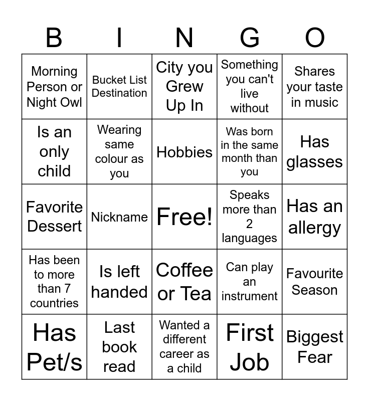 This bingo card has a free space and 24 words: Is left handed, Last book read, Hobbies, Has Pet/s, Shares your taste in music, Morning Person or Night Owl, Is an only child, Bucket List Destination, Speaks more than 2 languages, Coffee or Tea, Was born in the same month than you, Favorite Dessert, Can play an instrument, Favourite Season, Wearing same colour as you, First Job, Has an allergy, City you Grew Up In, Has glasses, Nickname, Biggest Fear, Has been to more than 7 countries, Something you can't live without and Wanted a different career as a child.