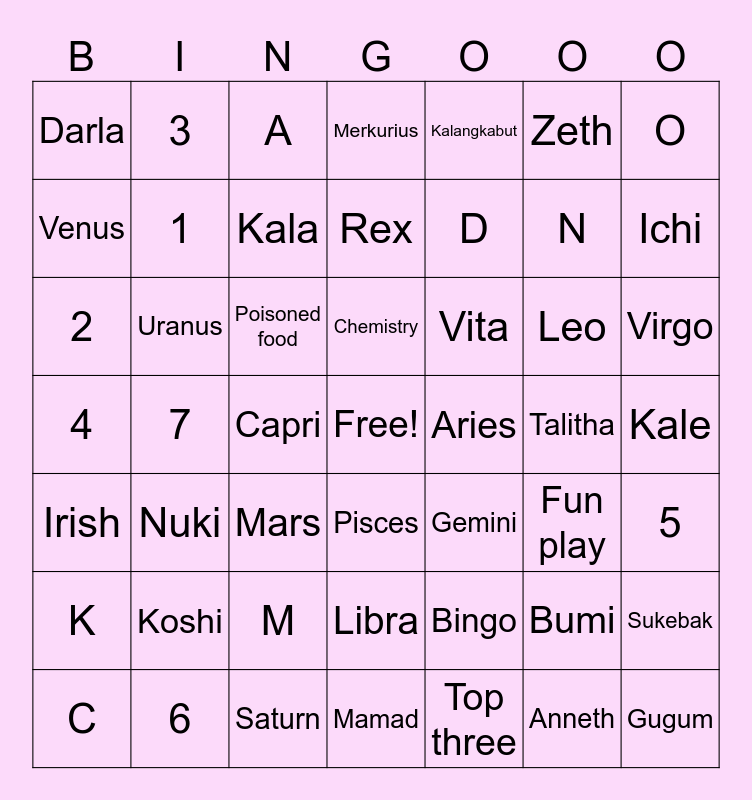 This bingo card has a free space and 48 words: Bingo, N, Mamad, 7, Poisoned food, Kale, 3, 6, Zeth, Pisces, O, Merkurius, Leo, Vita, K, Talitha, Venus, Ichi, Bumi, Kalangkabut, D, Capri, Darla, 1, Sukebak, Kala, Virgo, C, Chemistry, Uranus, Anneth, Aries, 5, Koshi, 4, Gemini, Fun play, 2, Mars, M, Irish, Gugum, A, Saturn, Rex, Libra, Nuki and Top three.