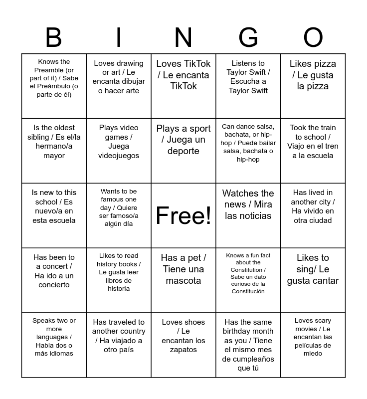 This bingo card has a free space and 24 words: Likes to read history books / Le gusta leer libros de historia, Has traveled to another country / Ha viajado a otro país, Plays a sport / Juega un deporte, Speaks two or more languages / Habla dos o más idiomas, Likes pizza / Le gusta la pizza, Knows the Preamble (or part of it) / Sabe el Preámbulo (o parte de él), Is the oldest sibling / Es el/la hermano/a mayor, Loves drawing or art / Le encanta dibujar o hacer arte, Watches the news / Mira las noticias, Has a pet / Tiene una mascota, Can dance salsa, bachata, or hip-hop / Puede bailar salsa, bachata o hip-hop, Is new to this school / Es nuevo/a en esta escuela, Knows a fun fact about the Constitution / Sabe un dato curioso de la Constitución, Likes to sing/ Le gusta cantar, Plays video games / Juega videojuegos, Has the same birthday month as you / Tiene el mismo mes de cumpleaños que tú, Has lived in another city / Ha vivido en otra ciudad, Loves TikTok / Le encanta TikTok, Took the train to school / Viajo en el tren a la escuela, Wants to be famous one day / Quiere ser famoso/a algún día, Loves scary movies / Le encantan las películas de miedo, Has been to a concert / Ha ido a un concierto, Listens to Taylor Swift / Escucha a Taylor Swift and Loves shoes / Le encantan los zapatos.