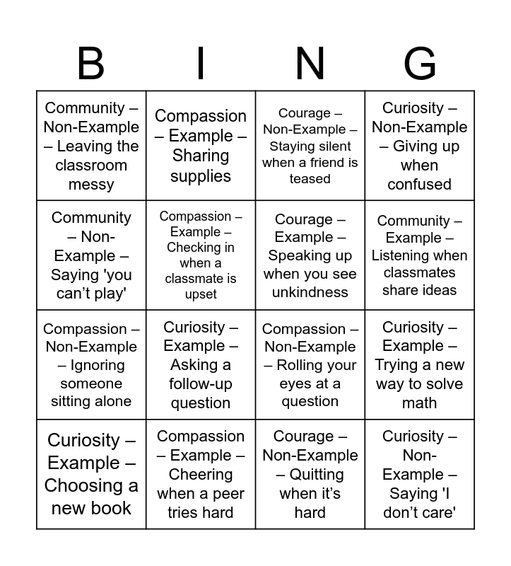 This bingo card has 24 words: Community – Example – Including someone in a group project, Community – Example – Helping clean up after art, Community – Example – Listening when classmates share ideas, Community – Non-Example – Whispering while someone presents, Community – Non-Example – Saying 'you can’t play', Community – Non-Example – Leaving the classroom messy, Compassion – Example – Checking in when a classmate is upset, Compassion – Example – Sharing supplies, Compassion – Example – Cheering when a peer tries hard, Compassion – Non-Example – Laughing at mistakes, Compassion – Non-Example – Ignoring someone sitting alone, Compassion – Non-Example – Rolling your eyes at a question, Courage – Example – Admitting when you make a mistake, Courage – Example – Raising your hand even if unsure, Courage – Example – Speaking up when you see unkindness, Courage – Non-Example – Copying homework, Courage – Non-Example – Quitting when it’s hard, Courage – Non-Example – Staying silent when a friend is teased, Curiosity – Example – Asking a follow-up question, Curiosity – Example – Trying a new way to solve math, Curiosity – Example – Choosing a new book, Curiosity – Non-Example – Saying 'I don’t care', Curiosity – Non-Example – Giving up when confused and Curiosity – Non-Example – Refusing to listen to new ideas.