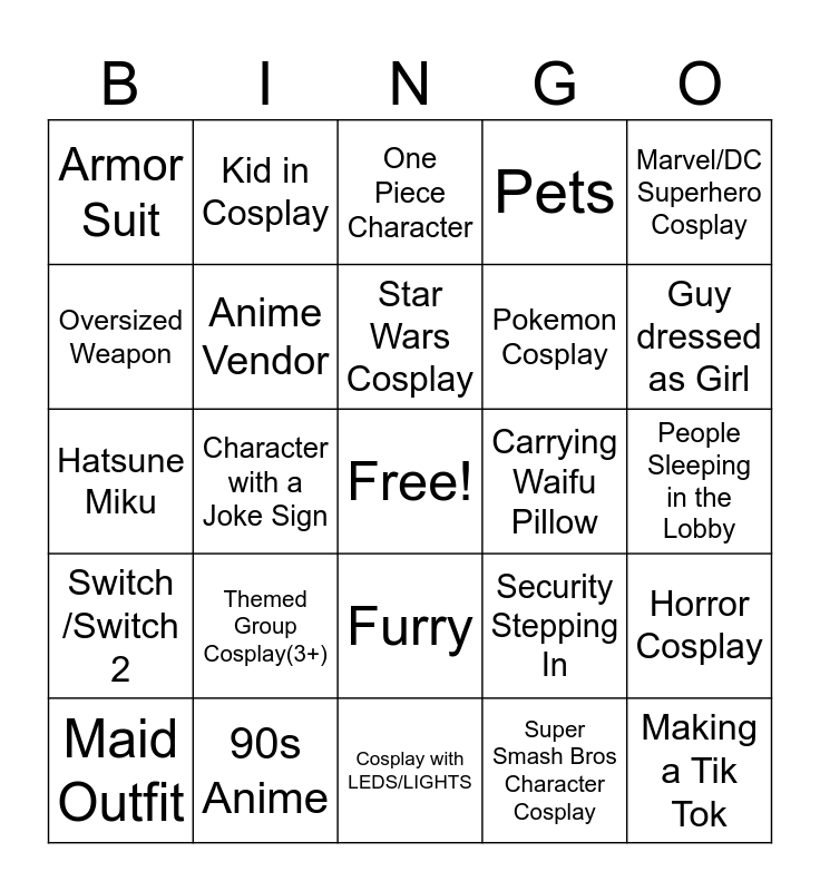 This bingo card has a free space and 24 words: Themed Group Cosplay(3+), 90s Anime, Star Wars Cosplay, Maid Outfit, Marvel/DC Superhero Cosplay, Armor Suit, Oversized Weapon, Kid in Cosplay, Carrying Waifu Pillow, Furry, Pokemon Cosplay, Hatsune Miku, Security Stepping In, Horror Cosplay, Anime Vendor, Super Smash Bros Character Cosplay, People Sleeping in the Lobby, One Piece Character, Guy dressed as Girl, Character with a Joke Sign, Making a Tik Tok, Switch /Switch 2, Pets and Cosplay with LEDS/LIGHTS.