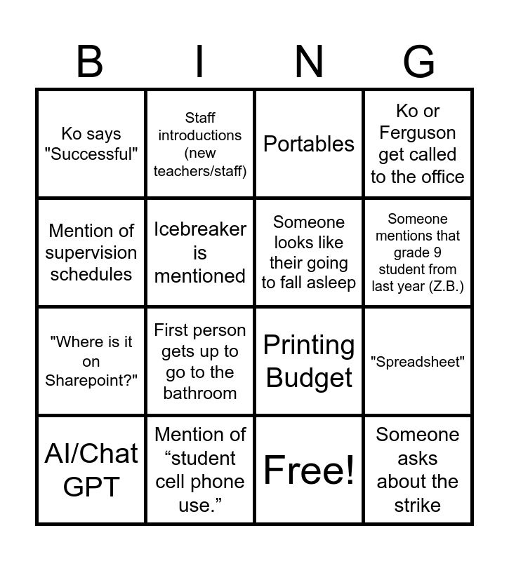 This bingo card has 17 words: Free!, AI/Chat GPT, Portables, Ko says "Successful", First person gets up to go to the bathroom, Ko or Ferguson get called to the office, "Spreadsheet", Someone looks like their going to fall asleep, Someone mentions that grade 9 student from last year (Z.B.), Icebreaker is mentioned, Mention of “student cell phone use.”, Printing Budget, Mention of supervision schedules, Staff introductions (new teachers/staff), "Where is it on Sharepoint?", Staff member’s phone goes off and Someone asks about the strike.