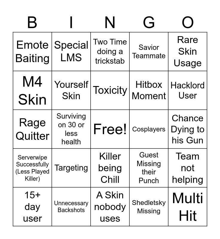 This bingo card has a free space and 24 words: Targeting, Unnecessary Backshots, Toxicity, 15+ day user, Rare Skin Usage, Emote Baiting, M4 Skin, Special LMS, Cosplayers, Killer being Chill, Hitbox Moment, Rage Quitter, Guest Missing their Punch, Team not helping, Yourself Skin, Shedletsky Missing, Chance Dying to his Gun, Two Time doing a trickstab, Hacklord User, Surviving on 30 or less health, Multi Hit, Serverwipe Successfully (Less Played Killer), Savior Teammate and A Skin nobody uses.