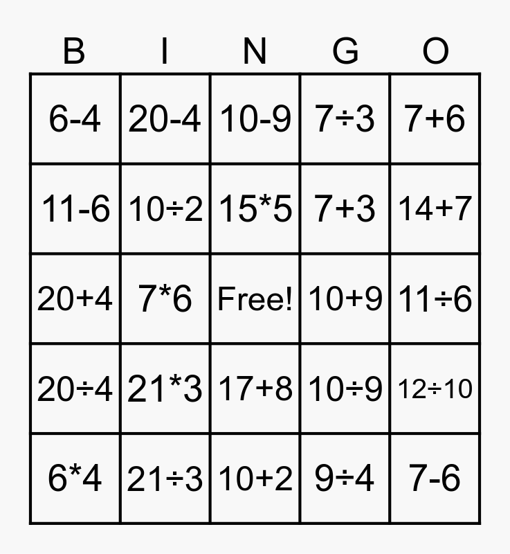 This bingo card has a free space and 56 words: 6+4, 6*4, 6÷4, 6-4, 10+2, 10*2, 10÷2, 10-2, 7+3, 7*3, 7÷3, 7-3, 12+1, 12*1, 12÷1, 12-1, 7+6, 7*6, 7÷6, 7-6, 10+9, 10*9, 10÷9, 10-9, 15+5, 15*5, 15÷5, 15-5, 14+7, 14*7, 14÷7, 14-7, 11+6, 11*6, 11÷6, 11-6, 20+4, 20*4, 20÷4, 20-4, 17+8, 17*8, 17÷8, 17-8, 21+3, 21*3, 21÷3, 21-3, 9+4, 9*4, 9÷4, 9-4, 12+10, 12*10, 12÷10 and 12-10.