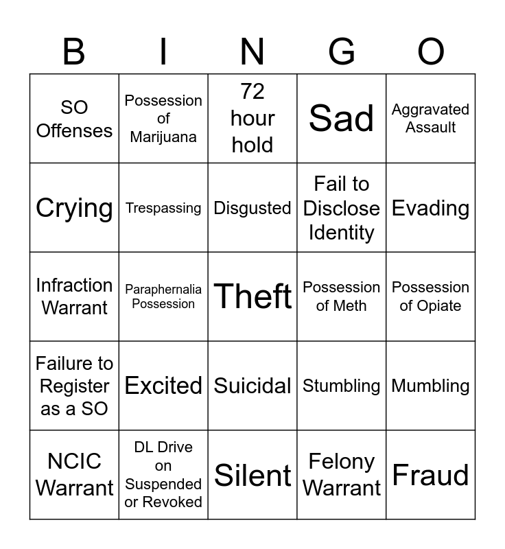 This bingo card has 35 words: DUI, Misdemeanor Warrant, DV Assault, Fail to Disclose Identity, Fraud, SO Offenses, Trespassing, Vagrancy, Possession of Meth, Weapon Possession of Unauthorized Person, Infraction Warrant, Possession of Marijuana, Suicidal, DV in the Presence of a Child, Aggravated Assault, Failure to Register as a SO, DL Drive on Suspended or Revoked, 72 hour hold, Felony Warrant, Possession of Opiate, NCIC Warrant, Paraphernalia Possession, Theft, Intoxication, Evading, Crying, Scared, Silent, Stumbling, Mumbling, Mad, Excited, Disgusted, Sad and Eager.