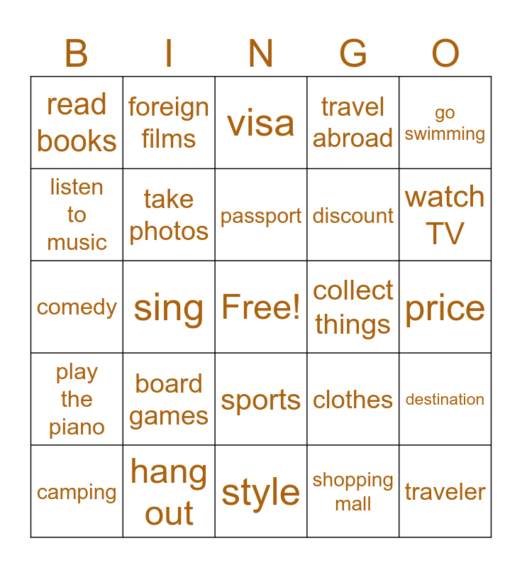 This bingo card has a free space and 24 words: camping, board games, passport, shopping mall, go swimming, read books, foreign films, visa, collect things, price, comedy, take photos, clothes, destination, listen to music, hang out, style, travel abroad, watch TV, play the piano, sing, sports, discount and traveler.