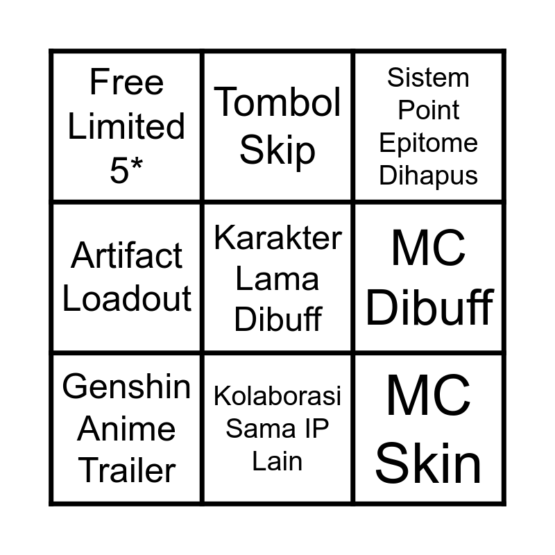 This bingo card has 9 words: Genshin Anime Trailer, Sistem Point Epitome Dihapus, Tombol Skip, Artifact Loadout, Free Limited 5*, MC Dibuff, Karakter Lama Dibuff, MC Skin and Kolaborasi Sama IP Lain.