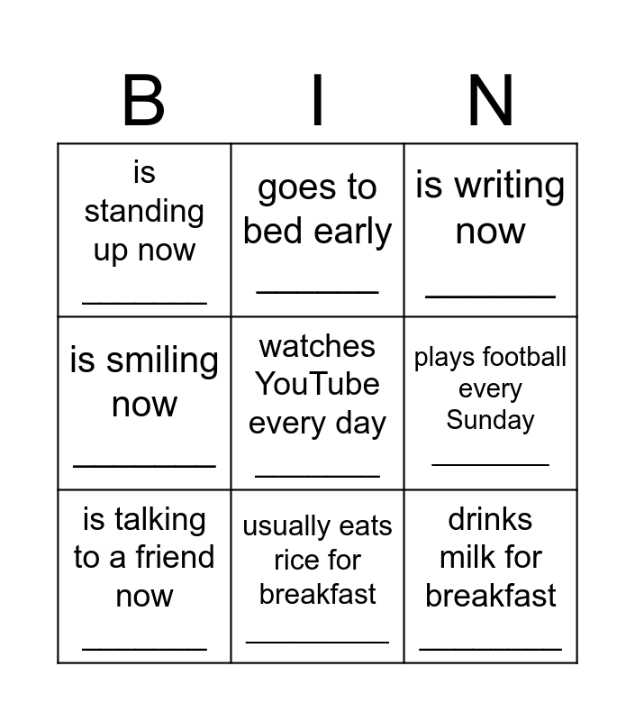 This bingo card has a free space and 8 words: plays football every Sunday ________, is writing now ______, goes to bed early ______, is talking to a friend now _______, is standing up now _______, drinks milk for breakfast ________, is smiling now _______ and usually eats rice for breakfast _________.