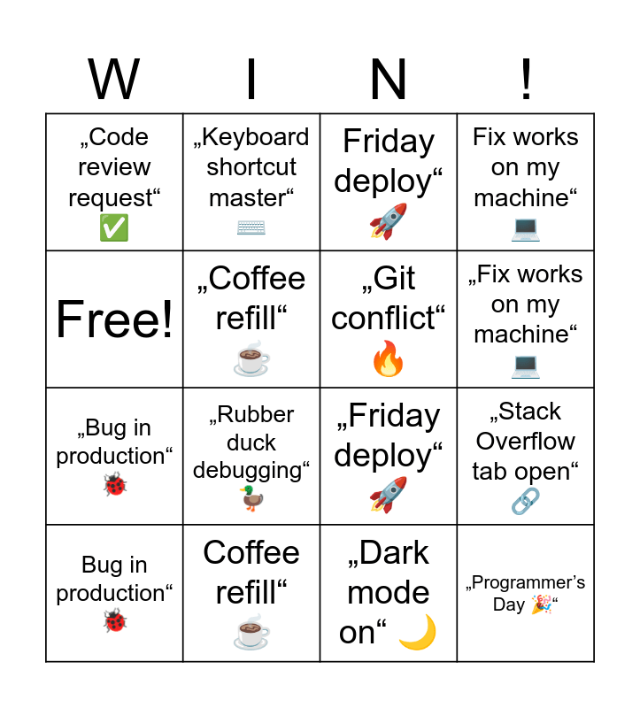 This bingo card has 17 words: Bug in production“ 🐞, Coffee refill“ ☕, Friday deploy“ 🚀, Fix works on my machine“ 💻, „Bug in production“ 🐞, „Coffee refill“ ☕, „Friday deploy“ 🚀, „Fix works on my machine“ 💻, Free!, „Rubber duck debugging“ 🦆, „Dark mode on“ 🌙, „Stack Overflow tab open“ 🔗, „Code review request“ ✅, „Keyboard shortcut master“ ⌨️, „Git conflict“ 🔥, „Programmer’s Day 🎉“ and „Team stand-up meeting“ 🧍.