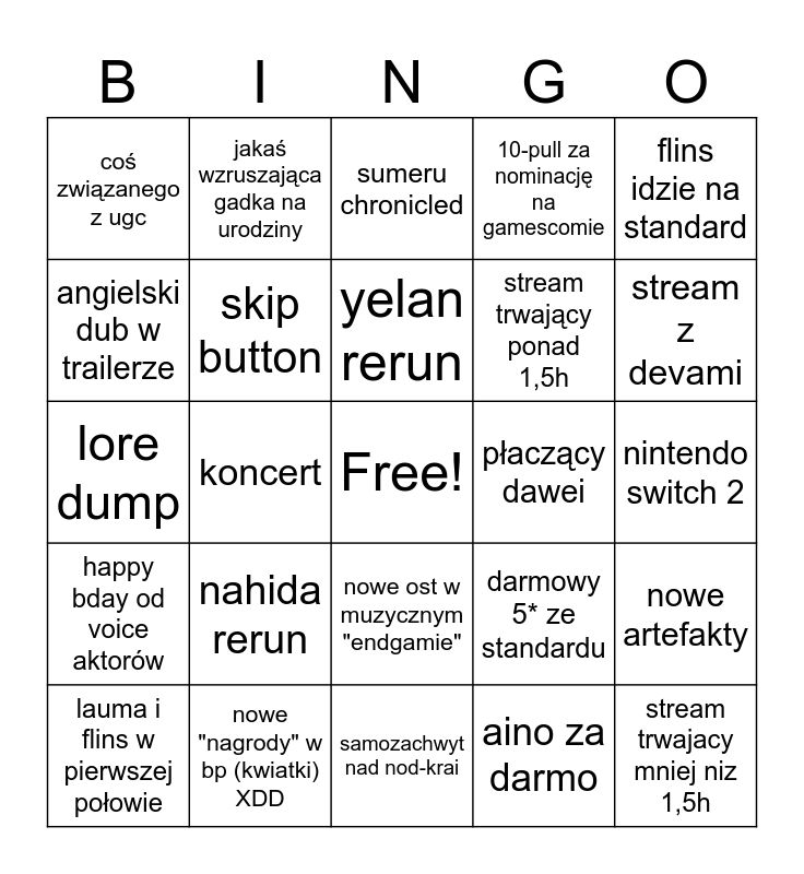 This bingo card has a free space and 24 words: lauma i flins w pierwszej połowie, nahida rerun, yelan rerun, aino za darmo, flins idzie na standard, coś związanego z ugc, jakaś wzruszająca gadka na urodziny, sumeru chronicled, płaczący dawei, nintendo switch 2, lore dump, skip button, darmowy 5* ze standardu, nowe artefakty, angielski dub w trailerze, nowe "nagrody" w bp (kwiatki) XDD, samozachwyt nad nod-krai, 10-pull za nominację na gamescomie, stream z devami, happy bday od voice aktorów, koncert, nowe ost w muzycznym "endgamie", stream trwający ponad 1,5h and stream trwajacy mniej niz 1,5h.