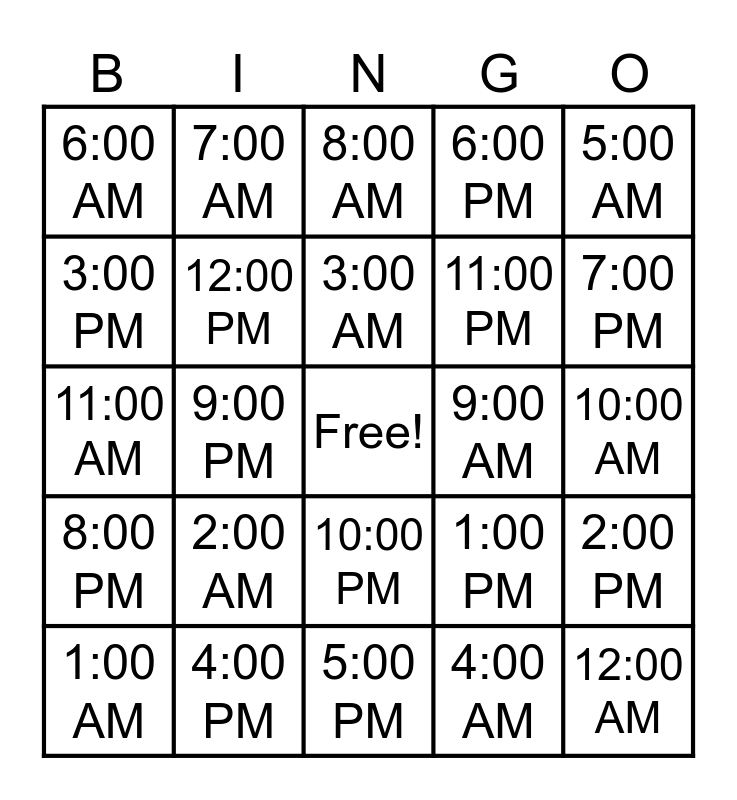 This bingo card has a free space and 24 words: 1:00 AM, 2:00 AM, 3:00 AM, 4:00 AM, 5:00 AM, 6:00 AM, 7:00 AM, 8:00 AM, 9:00 AM, 10:00 AM, 11:00 AM, 12:00 PM, 1:00 PM, 2:00 PM, 3:00 PM, 4:00 PM, 5:00 PM, 6:00 PM, 7:00 PM, 8:00 PM, 9:00 PM, 10:00 PM, 11:00 PM and 12:00 AM.