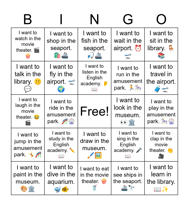 This bingo card has a free space and 29 words: I want to paint in the museum. π¨ποΈ, I want to swim in the aquarium. ππ, I want to ride in the amusement park. π’π‘, I want to read in the library. π, I want to watch in the movie theater. π¬πΏ, I want to fish in the seaport. π£π’, I want to fly in the airport. π«π, I want to study in the English academy. βοΈπ, I want to look in the museum. πποΈ, I want to dive in the aquarium. π€Ώπ , I want to play in the amusement park. π π‘, I want to learn in the library. πβ¨, I want to eat in the movie theater. πΏπ₯€, I want to see ships in the seaport. π’π, I want to travel in the airport. π§³π«, I want to write in the English academy. ππ, I want to draw in the museum. ποΈπΌοΈ, I want to jump in the amusement park. π€Έπ’, I want to sit in the library. πͺπ, I want to laugh in the movie theater. ππ¬, I want to sing in the English academy. π€π, I want to walk in the aquarium. πΆπ , I want to run in the amusement park. ππ , I want to talk in the library. π€«π¬, I want to wait in the airport. β°π«, I want to shop in the seaport. ποΈπ’, I want to clap in the movie theater. ππ₯, I want to listen in the English academy. ππ and I want to climb in the aquarium. π§ββοΈπ .