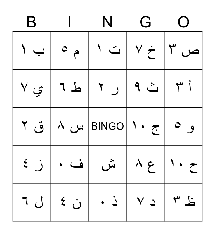This bingo card has a free space and 24 words: ف ٠, ن ٤, ر ٢, ل ٦, ص ٣, ب ١, ي ٧, م ٥, ج ١٠, ش, ث ٩, ق ٢, ع ٨, ح ١٠, ط ٦, د ٧, و ٥, ت ١, أ ٣, س ٨, ظ ٣, ز ٤, خ ٧ and ذ ٠.