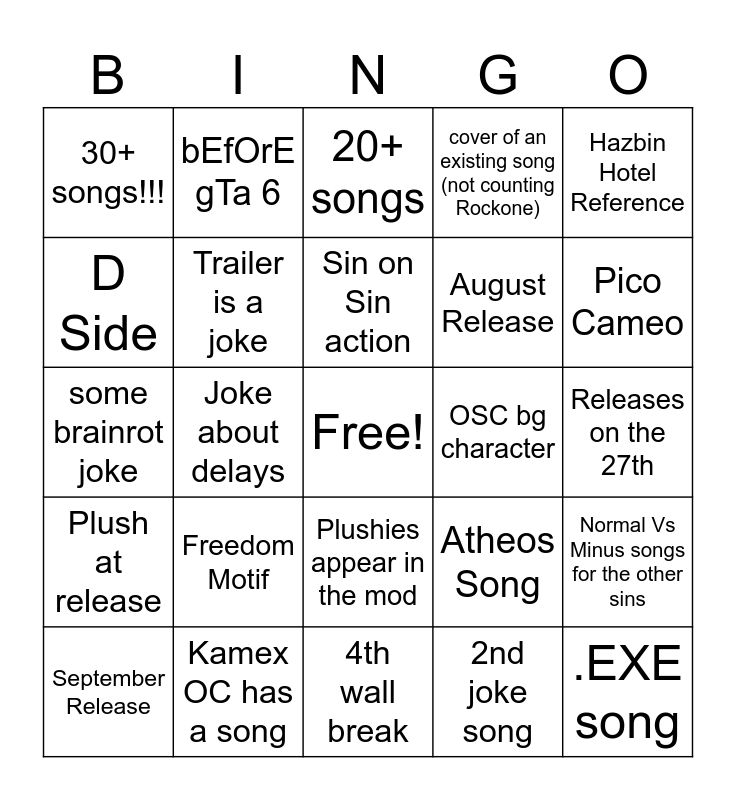 This bingo card has a free space and 24 words: Freedom Motif, Kamex OC has a song, Sin on Sin action, September Release, Hazbin Hotel Reference, 30+ songs!!!, D Side, bEfOrE gTa 6, OSC bg character, Plushies appear in the mod, August Release, some brainrot joke, Atheos Song, Normal Vs Minus songs for the other sins, Trailer is a joke, 2nd joke song, Releases on the 27th, 20+ songs, Pico Cameo, Joke about delays, .EXE song, Plush at release, cover of an existing song (not counting Rockone) and 4th wall break.