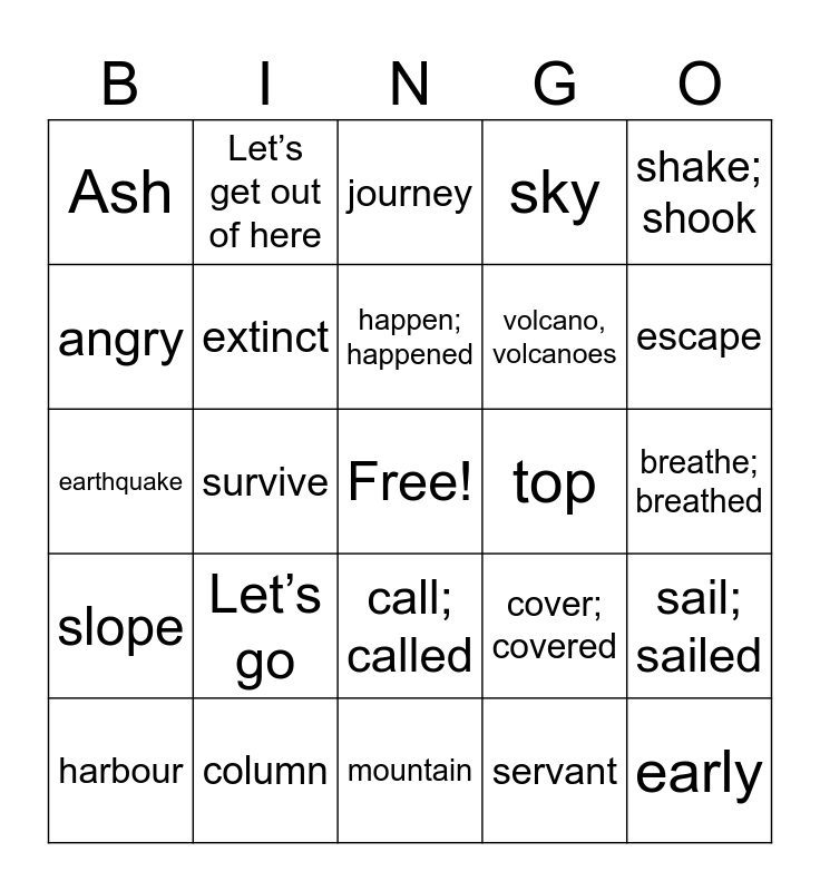 This bingo card has a free space and 44 words: Lava, early, produced, harbour, Be a good girl, servant, journey, suddenly, shake; shook, column, sky, top, call; called, Let’s go, Hurry up, mountain, ground, earthquake, take, escape, Let’s get out of here, far away, Don’t be afraid, Ash, Cushion, breathe; breathed, dark, cloud, cover; covered, slope, blow; blew, sail; sailed, rough, try; tried, survive, look back, sad, scared, happen; happened, angry, volcano, volcanoes, dormant, extinct and active.