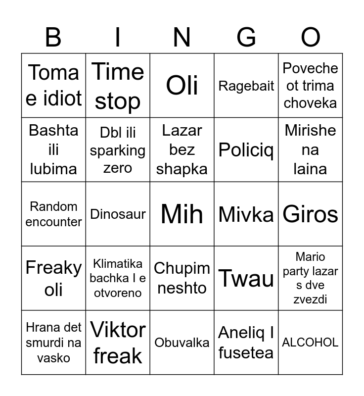 This bingo card has 25 words: Freaky oli, Viktor freak, Mih, Aneliq I fusetea, Poveche ot trima choveka, Toma e idiot, Time stop, Oli, Mivka, Mario party lazar s dve zvezdi, Bashta ili lubima, Dbl ili sparking zero, Obuvalka, Twau, Mirishe na laina, Hrana det smurdi na vasko, Dinosaur, Lazar bez shapka, Policiq, Giros, Random encounter, Klimatika bachka I e otvoreno, Chupim neshto, Ragebait and ALCOHOL.