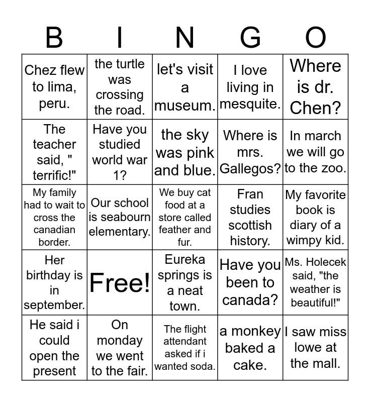 This bingo card has a free space and 24 words: Free!, On monday we went to the fair., the sky was pink and blue., He said i could open the present, Where is dr. Chen?, Chez flew to lima, peru., The teacher said, " terrific!", the turtle was crossing the road., Fran studies scottish history., Eureka springs is a neat town., Where is mrs. Gallegos?, My family had to wait to cross the canadian border., Have you been to canada?, Ms. Holecek said, "the weather is beautiful!", Have you studied world war 1?, a monkey baked a cake., My favorite book is diary of a wimpy kid., let's visit a museum., In march we will go to the zoo., Our school is seabourn elementary., I saw miss lowe at the mall., Her birthday is in september., I love living in mesquite. and The flight attendant asked if i wanted soda..