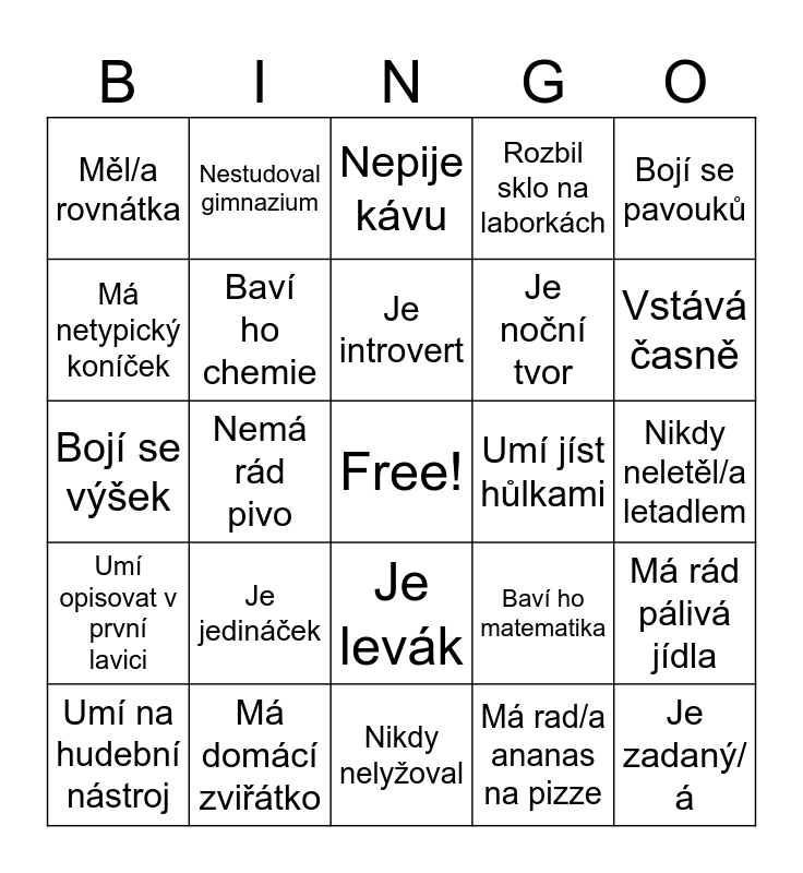 This bingo card has a free space and 24 words: Je jedináček, Má domácí zviřátko, Je introvert, Umí na hudební nástroj, Bojí se pavouků, Měl/a rovnátka, Má netypický koníček, Nestudoval gimnazium, Umí jíst hůlkami, Je levák, Je noční tvor, Bojí se výšek, Baví ho matematika, Má rád pálivá jídla, Baví ho chemie, Má rad/a ananas na pizze, Nikdy neletěl/a letadlem, Nepije kávu, Vstává časně, Nemá rád pivo, Je zadaný/á, Umí opisovat v první lavici, Rozbil sklo na laborkách and Nikdy nelyžoval.