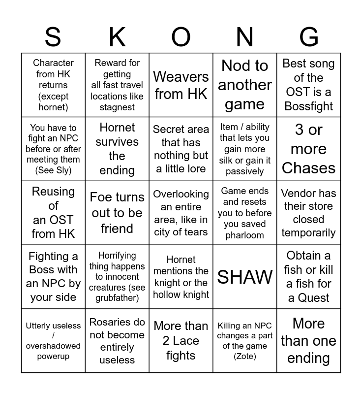 This bingo card has 25 words: Horrifying thing happens to innocent creatures (see grubfather), More than 2 Lace fights, Secret area that has nothing but a little lore, Utterly useless / overshadowed powerup, Best song of the OST is a Bossfight, Character from HK returns (except hornet), You have to fight an NPC before or after meeting them (See Sly), Reward for getting all fast travel locations like stagnest, Game ends and resets you to before you saved pharloom, Hornet mentions the knight or the hollow knight, Item / ability that lets you gain more silk or gain it passively, Reusing of an OST from HK, SHAW, Obtain a fish or kill a fish for a Quest, Hornet survives the ending, More than one ending, Vendor has their store closed temporarily, Weavers from HK, 3 or more Chases, Foe turns out to be friend, Overlooking an entire area, like in city of tears, Rosaries do not become entirely useless, Fighting a Boss with an NPC by your side, Nod to another game and Killing an NPC changes a part of the game (Zote).