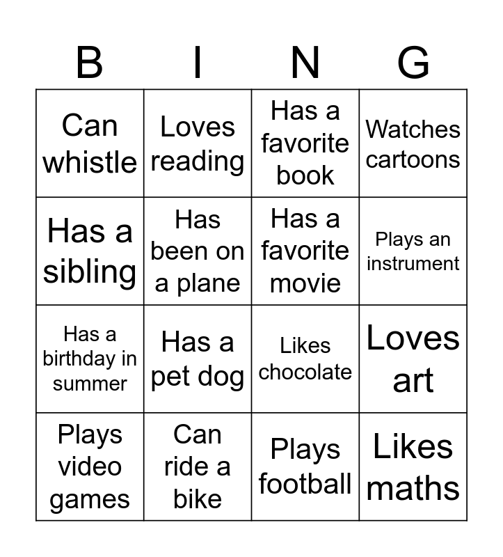 This bingo card has 26 words: Free!, Has a pet, Plays an instrument, Likes pizza, Has a sibling, Can whistle, Has been on a plane, Loves reading, Plays football, Can draw, Has a birthday in summer, Likes chocolate, Has a nickname, Speaks another language, Loves art, Has a pet cat, Watches cartoons, Likes maths, Has a favorite book, Plays video games, Has a pet dog, Loves sports, Can ride a bike, Likes swimming, Has a favorite movie and Likes music.