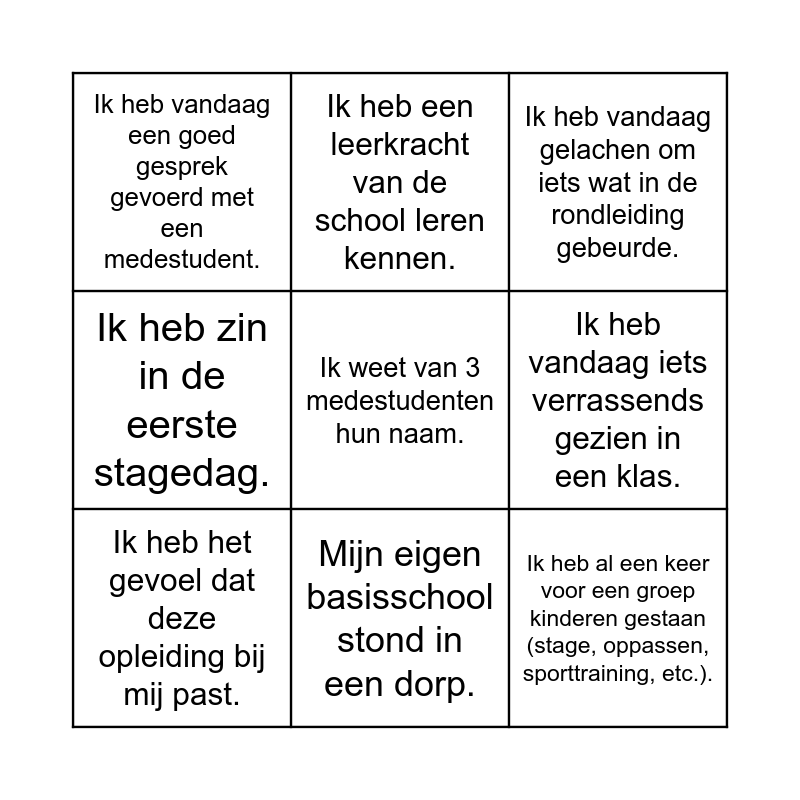 This bingo card has 12 words: Ik ben vandaag (bijna) verdwaald in de school., Ik heb al een keer voor een groep kinderen gestaan (stage, oppassen, sporttraining, etc.)., Ik weet van 3 medestudenten hun naam., Ik heb vandaag iets verrassends gezien in een klas., Ik heb een leerkracht van de school leren kennen., Ik heb vandaag gelachen om iets wat in de rondleiding gebeurde., Mijn eigen basisschool stond in een dorp., Ik heb al een idee welk vak of leergebied ik het leukst ga vinden., Ik heb vandaag een goed gesprek gevoerd met een medestudent., Ik heb zin in de eerste stagedag., Ik heb het gevoel dat deze opleiding bij mij past. and Ik voel me soms onzeker over mijn opleidingskeuze..