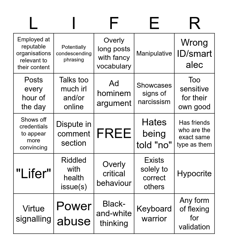 This bingo card has a free space and 24 words: Riddled with health issue(s), Power abuse, Ad hominem argument, Virtue signalling, Wrong ID/smart alec, Employed at reputable organisations relevant to their content, Posts every hour of the day, Potentially condescending phrasing, Hates being told "no", Overly critical behaviour, Showcases signs of narcissism, Shows off credentials to appear more convincing, Exists solely to correct others, Hypocrite, Talks too much irl and/or online, Keyboard warrior, Has friends who are the exact same type as them, Overly long posts with fancy vocabulary, Too sensitive for their own good, Dispute in comment section, Any form of flexing for validation, "Lifer", Manipulative and Black-and-white thinking.