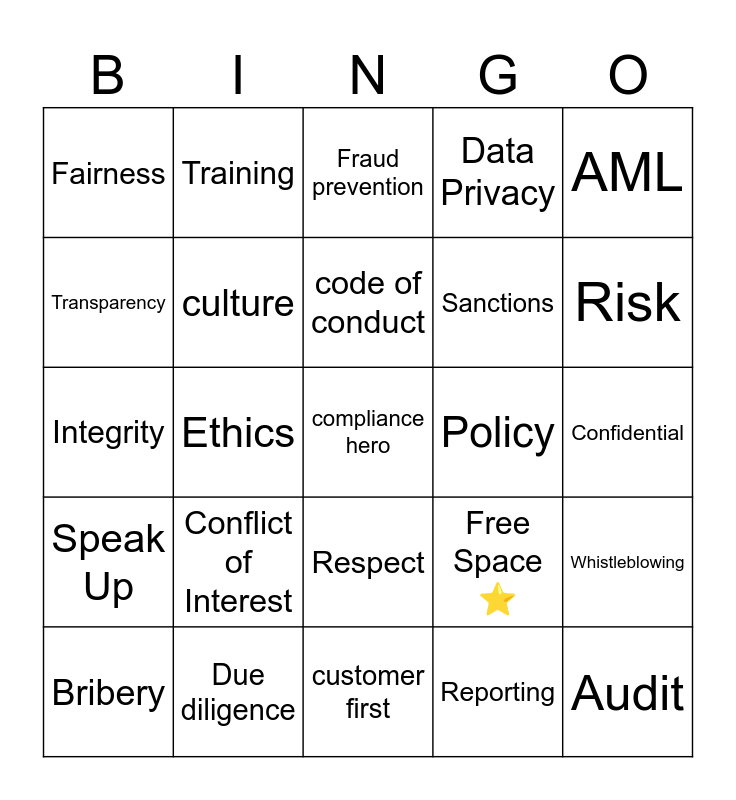 This bingo card has 25 words: Speak Up, Due diligence, compliance hero, Reporting, AML, Fairness, Training, Fraud prevention, Policy, Whistleblowing, Transparency, culture, customer first, Free Space ⭐, Risk, Bribery, Ethics, code of conduct, Sanctions, Confidential, Integrity, Conflict of Interest, Respect, Data Privacy and Audit.