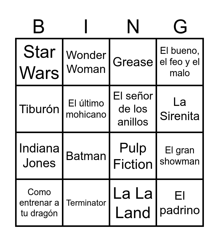 This bingo card has 53 words: Free!, Como entrenar a tu dragón, Kung Fu Panda, El rey león, Frozen, Gladiator, Wonder Woman, Los Vengadores, El último mohicano, Harry Potter, El señor de los anillos, La Roca, Titanic, Piratas del Caribe, Rush, Spirit, La Sirenita, Terminator, El hombre de la máscara de hierro, Tiburón, El gran showman, Jurassic Park, Indiana Jones, Star Wars, Rocky, Forest Gump, Pearl Harbor, La isla, El hombre de acero, Batman, Braveheart, La pantera rosa, Memorias de África, La lista de Schindler, La vida es bella, E.T, El bueno, el feo y el malo, Moulin Rouge, Grease, Bailando con lobos, Interstellar, Regreso al futuro, La La Land, Matrix, La bella y la bestia, Lo que el viento se llevó, Aladdin, Amélie, Pulp Fiction, El padrino, 2001: Una odisea en el espacio, Origen and Psicosis.