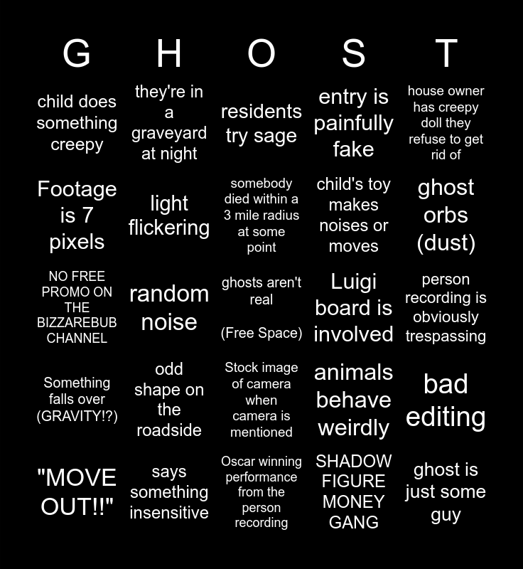 This bingo card has a free space and 24 words: odd shape on the roadside, says something insensitive, somebody died within a 3 mile radius at some point, "MOVE OUT!!", house owner has creepy doll they refuse to get rid of, child does something creepy, Footage is 7 pixels, they're in a graveyard at night, Luigi board is involved, Stock image of camera when camera is mentioned, child's toy makes noises or moves, NO FREE PROMO ON THE BIZZAREBUB CHANNEL, animals behave weirdly, bad editing, light flickering, SHADOW FIGURE MONEY GANG, person recording is obviously trespassing, residents try sage, ghost orbs (dust), random noise, ghost is just some guy, Something falls over (GRAVITY!?), entry is painfully fake and Oscar winning performance from the person recording.