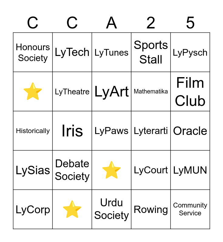 This bingo card has 25 words: Debate Society, Urdu Society, LyArt, LyCorp, LyPysch, Honours Society, ⭐️, LyTech, Lyterarti, ⭐️, Mathematika, Historically, LyCourt, LyMUN, LyTheatre, Community Service, Oracle, LyTunes, Film Club, Iris, LyPaws, ⭐️, LySias, Sports Stall and Rowing.