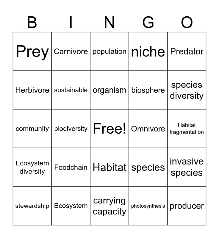 This bingo card has a free space and 24 words: Foodchain, Ecosystem, organism, stewardship, Predator, Prey, Herbivore, Carnivore, Omnivore, Habitat, biosphere, community, species, invasive species, sustainable, photosynthesis, Habitat fragmentation, population, species diversity, biodiversity, producer, Ecosystem diversity, niche and carrying capacity.